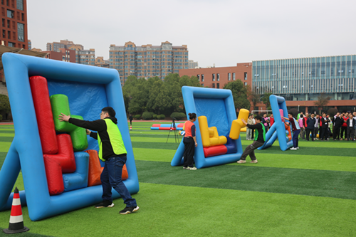 赛场之上,四大趣味项目各显巧思:“俄罗斯方块”拼搭默契,“雷霆战鼓”敲响协作,“障碍竞速”驰骋激情,“穿越人墙”传递信任。随着裁判一声哨响,11支分工会队伍即刻投身角逐。褪去讲台的严谨,老师们化身热血健儿,指尖的粉笔灰换成掌心的协作力,案头的教案变成赛场上的冲锋号,秋风中跃动的身影,是对拼搏最生动的诠释。
