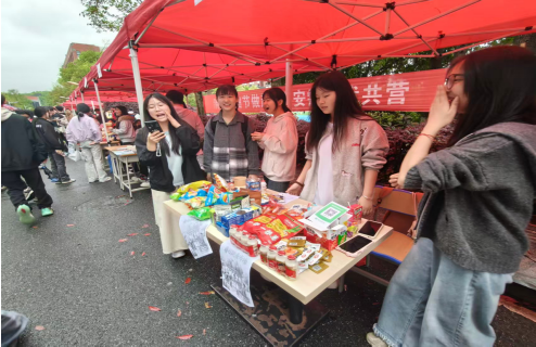 另一边的特色零食市集同样热闹非凡,各类美味零食琳琅满目。同学们化身“小摊主”,热情地向来往师生介绍、推荐,吆喝声、欢笑声交织在一起,让整个跳蚤市场充满了烟火气与幸福感。